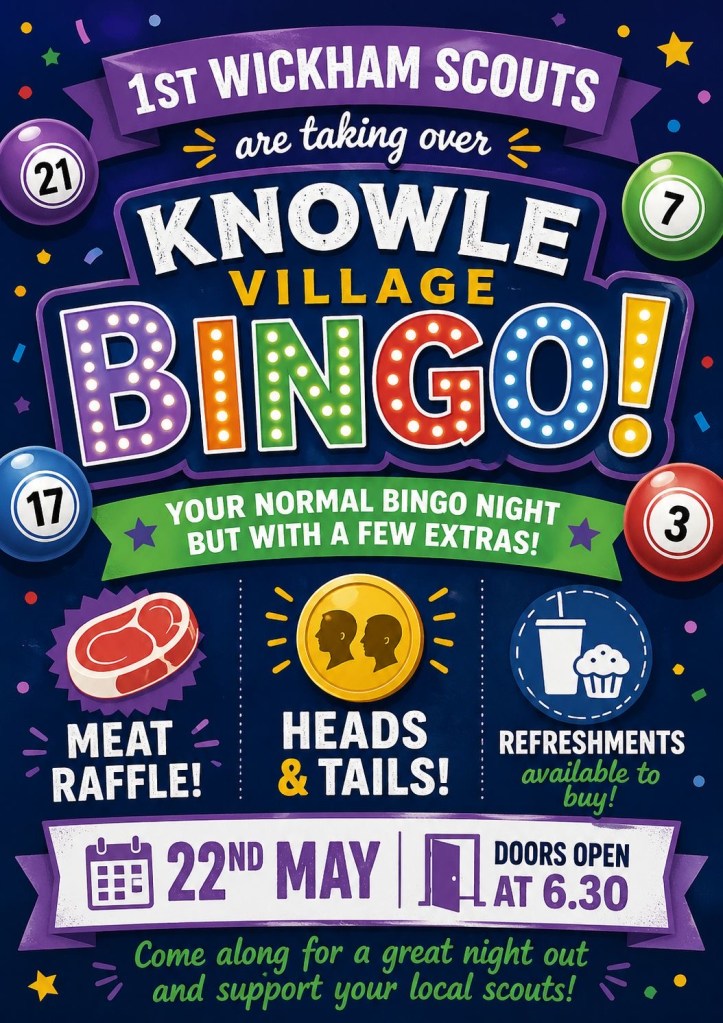 The 1st Wickham Scouts are taking over our regular Bingo Night at Knowle Village Hall!